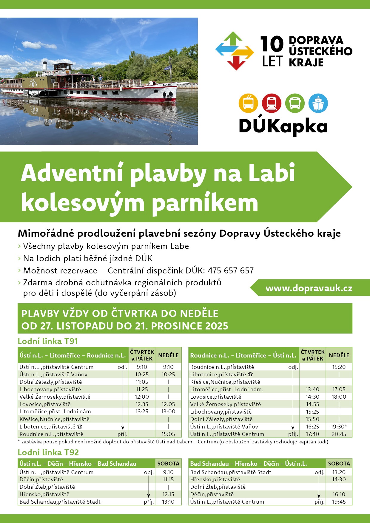 ČESKÉ STŘEDOHOŘÍ – Doprava Ústeckého kraje letos připravila adventní plavby pro veřejnost. Lidé se budou moci svézt unikátním kolesovým parníkem Labe na linkách T91 a T92. Vůbec poprvé bude možné využít lodní dopravu i v období před vánočními svátky, a to v rámci běžného tarifu DÚK bez jakýchkoliv příplatků.