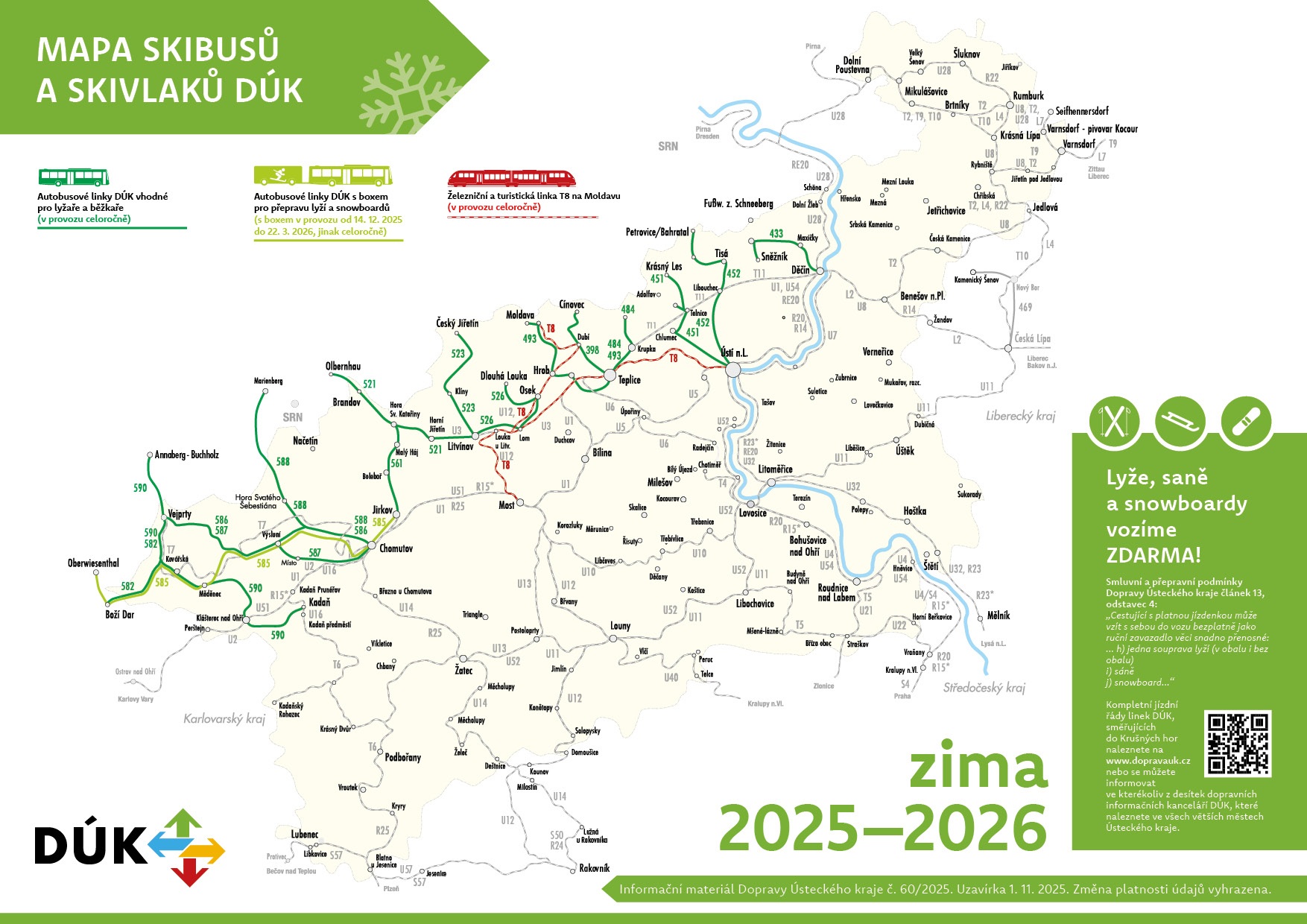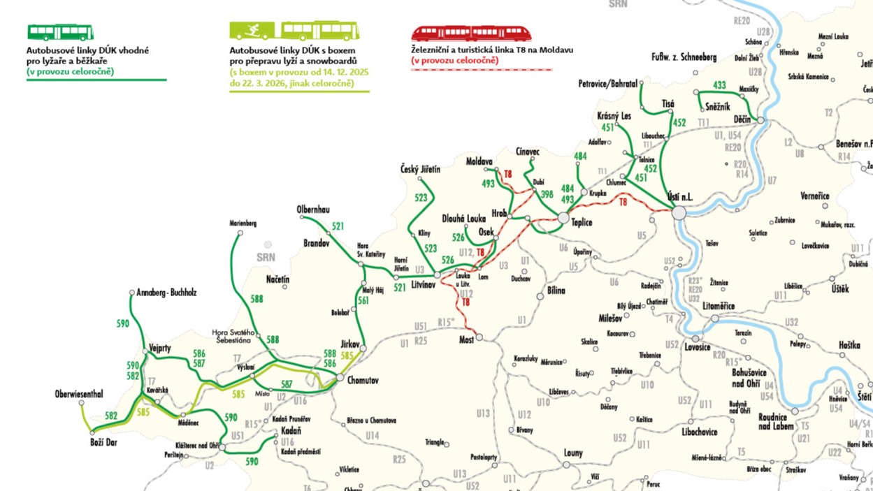 Skibusy a skivlaky zajišťují přímé spojení do oblíbených horských středisek, jako jsou například Telnice, Moldava, Cínovec, Boží Dar, Klíny nebo Petrovice. Díky pravidelným spojům se mohou cestující dostat do hor bez auta a s jistotou, že se vyhnou kolonám i problémům s parkováním.