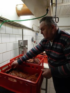 Majitel řeznicví Jiří Hlinka vykládá z přepravek četstvě vyuzená vepřová žebra