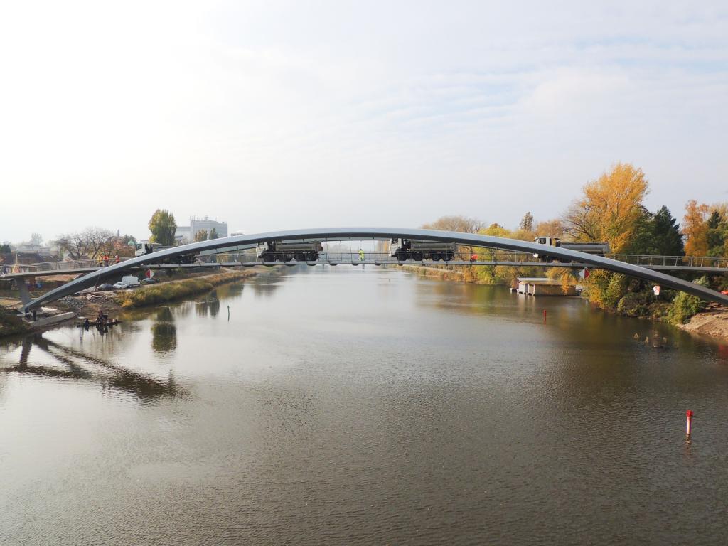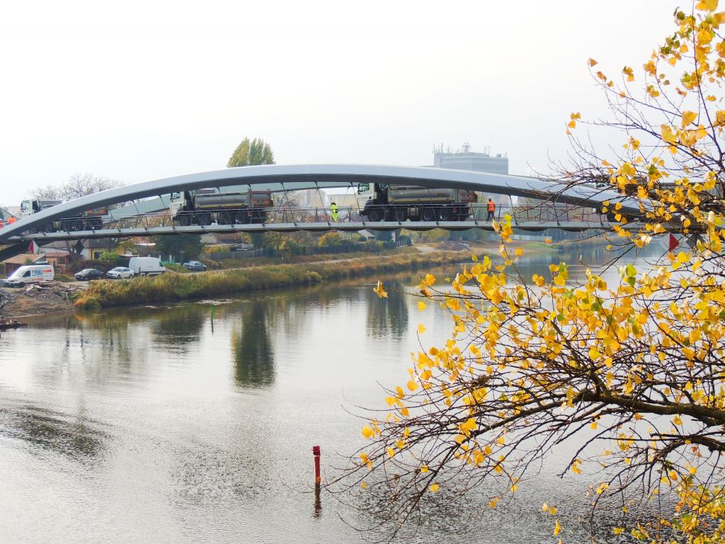NYMBURK – Lávka přes Labe pro pěší a cyklisty prošla 1. listopadu zatěžkávací zkouškou. Na stavbě se přitom ještě pořád pracuje. Protiskluzná pochozí vrstva lávky, montáž zábradlí s osvětlením a dlažby pod lávkou a povrchy vozovek v blízkém okolí s návazností na lávku. To jsou aktuální práce na nové lávce i pod ní. Stavební firma HOCHTIEF CZ již zároveň odstraňuje pomocné prvky jako skruže, poloostrovy a dočasné piloty v Labi.