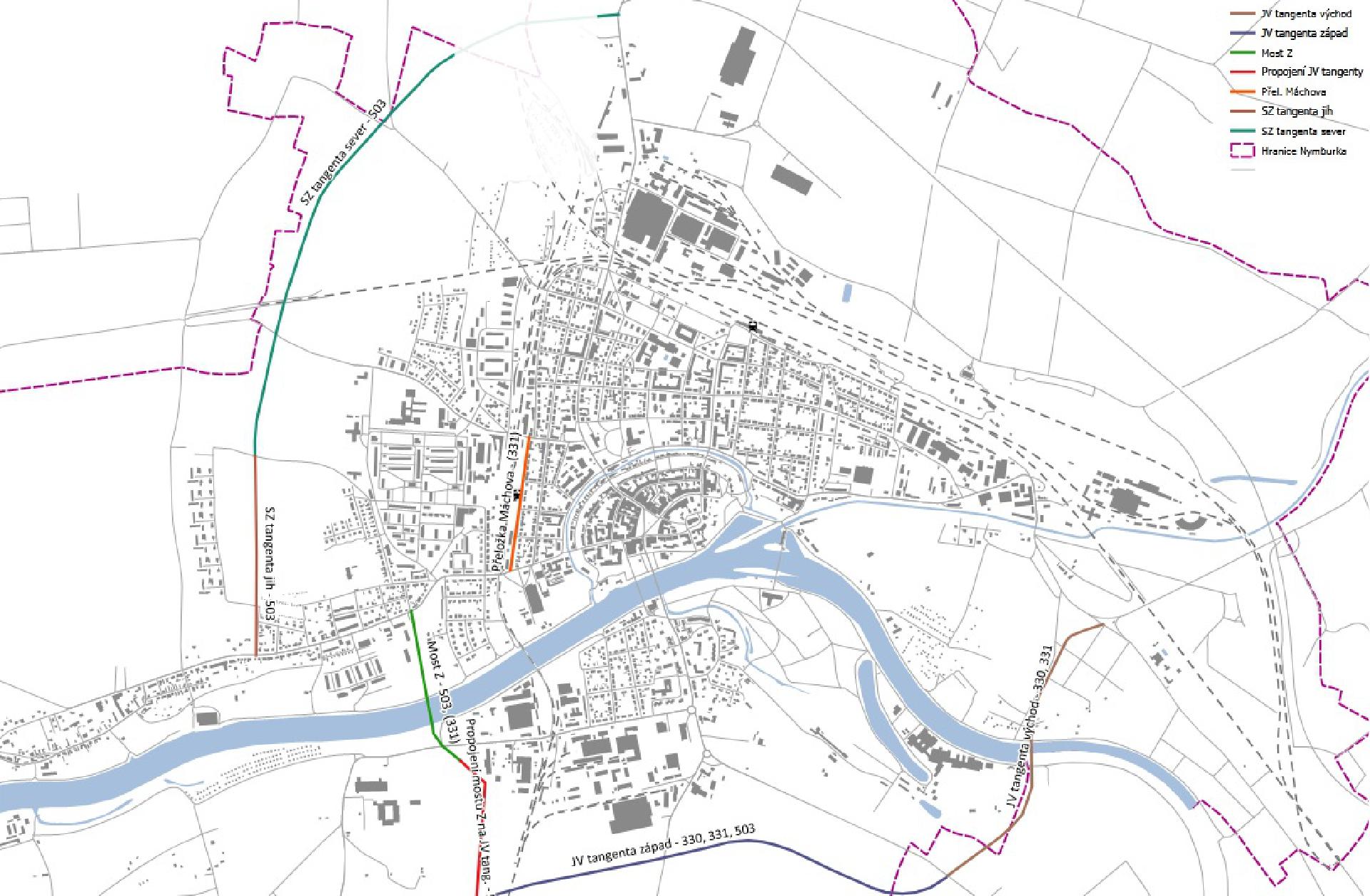 Přibližný zákres neuskutečněné Západní varianty obchvatu Nymburka.