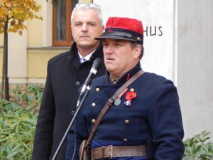 V obsáhlé řeči podplukovníka ve výslužbě Vladimíra Rykla (sloužil jako důstojník od roku 1962 do roku 1965, pak byl z politických důvodů z armády propuštěn, do služby se vrátil až v roce 1990, kdy sloužil u vojenského dopravního letectva v Praze-Kbelích) zaznělo mimo jiné, že za Velké války padlo na 10 milionů vojáků na všech frontách. “Den válečných veteránů u nás slavíme od roku 2001 a Nymburk byl jedním z prvních okresů, kde tato událost byla slavena a na všech výročích byl vždy přítomen starosta,” poděkoval Rykl a přidal přání, aby k žádným ozbrojeným konfliktům už nedošlo. Vojenský vysloužilec také zrekapitulovat vznik, průběh a ukončení I. světové války a vyzvihl příspěvek československých legií ke konci války a rozpadu Rakouska – Uherska. “Díky tímo, že legie z českých a slovenských vojáků významně přispěly k ukončení první světové války, daly mandát Tomáši Garrigue Masarykovi a Milanu Rastislavu Štefánikovi při vyjednávání se světovými mocnostmi o vzniku nezávislého svobodného státu Čechoslováků,” s povděkem konstatoval podplukovník Vladimír Rykl.