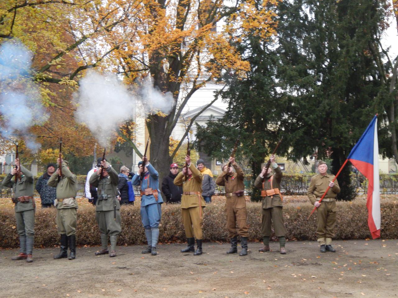 Před šikem členů Klubu vojenské historie Druhého pluku Nymbursko připomněl starosta města Tomáš Mach vznik tradice Dne válečných veteránů právě před sto lety, 11.11.1919 ve Velké Británii, jako oslavy prvního výročí ukončení I. světové války a pocty všem padlým. Zároveň vyjádřil potřebu takovou tradici dodržovat a ctít.