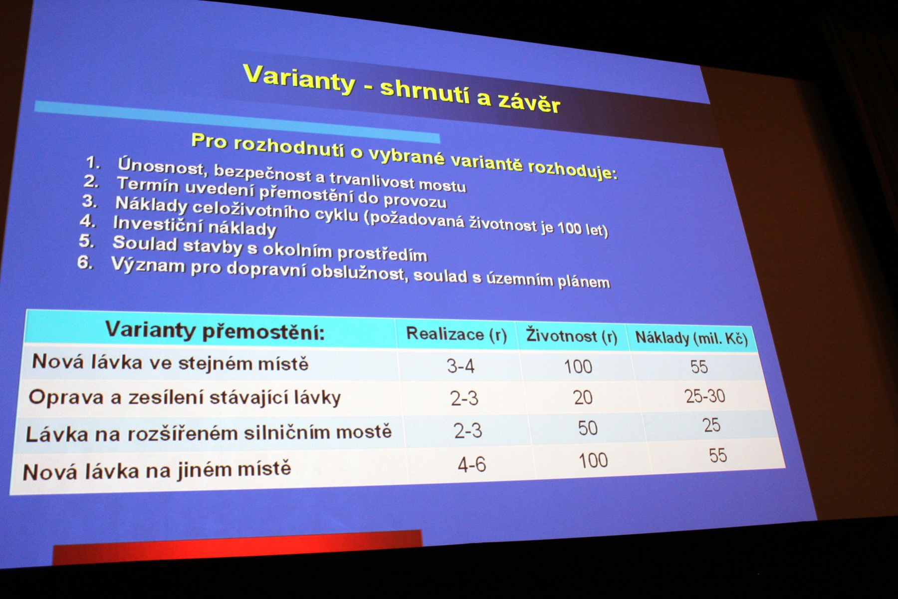 Jako třetí řečník vystoupil inženýr Milan Valný z firmy PONTEX. Na několika obrazech velice výstižně ukázal problémy trojské lávky a nastínil tak možná rizika u té nymburské, která je ještě o několik metrů delší a tedy problematičtější, co se týče údržby i samotných konstrukčních vad a nedostatků. V další tabulce nastínil čtyři možné varianty řešení přemostění, včetně jejich životnosti a nákladů na stavbu. Nejméně výhodná, by dle jeho slov, byla varianty zpevnění staré lávky přidáním dalších ocelových výstuží po stranách s náklady přes 25 milionů, realizací do 2 -3 let a s životností maximálně 20 let. Druhou variantou je zbudování nové lávky připevněné ke kamennému mostu, kde je odhadovaný náklad také cca 25 milionů a doba realizace 2 – 3 roky s životností 50 let. Nicméně zde město naráží na neochotu vlastníka ŘSD, který má most opravit a převést do správy Středočeského kraje. Dalším řešením je stavba lávky nové, kdy doba realizace je odhadována od 3 do 6 let a cena by byla do 55 milionů včetně DPH. Do této částky však není zahrnuta cena za demolici stávající lávky v hodnotě cca 6 milionů korun.