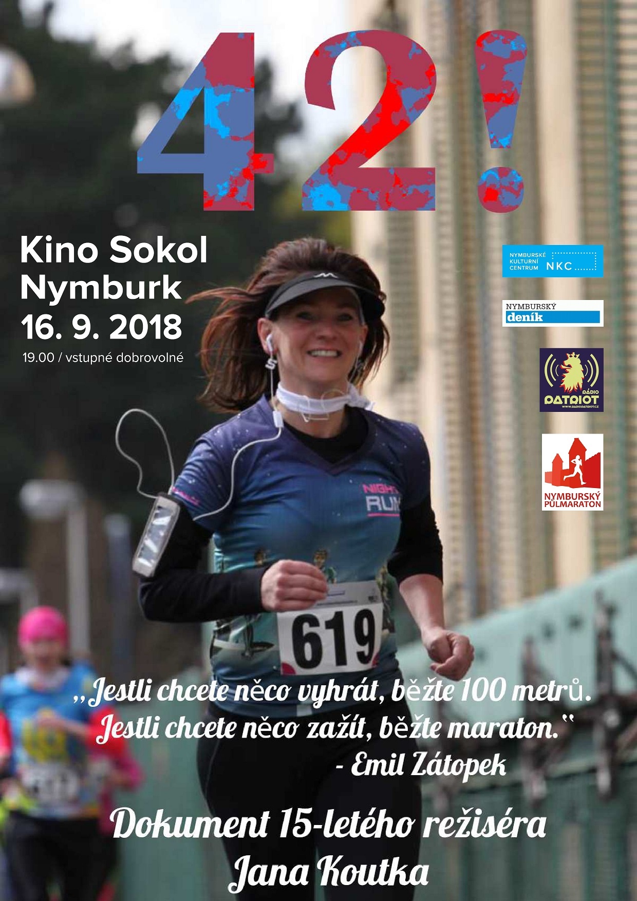 NYMBURK – Nymburské kino Sokol promítne v neděli 16. září 2018 od 19 hodin dokument filmaře, režiséra a také patnáctiletého nymburského studenta Jana Koutka o nymburské běžkyni, která se připravuje na svůj první maraton. Film s názvem „42!“ je symbolikou čtyřiceti dvou kilometrů běžeckého závodu, kterému předchází jeden rok příprav. Pro režiséra Jana Koutka, který započal práce na filmu ve svých 13 letech, byl velkou inspirací krátkometrážní film o závodním běhu od britského filmaře Simona Cada.